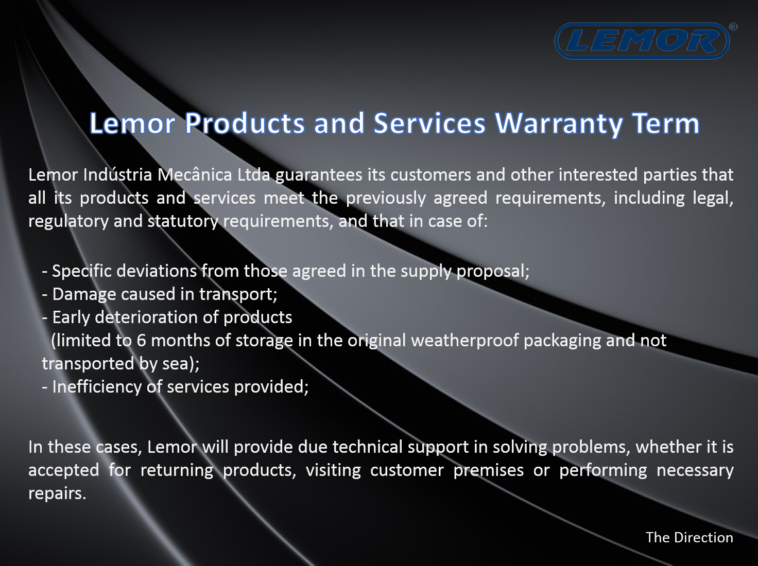Lemor's quality policy is to be recognized in the market as a supplier of components and equipment for several segments, meeting the demand of its customers and the search for new market segments in Brazil and abroad.