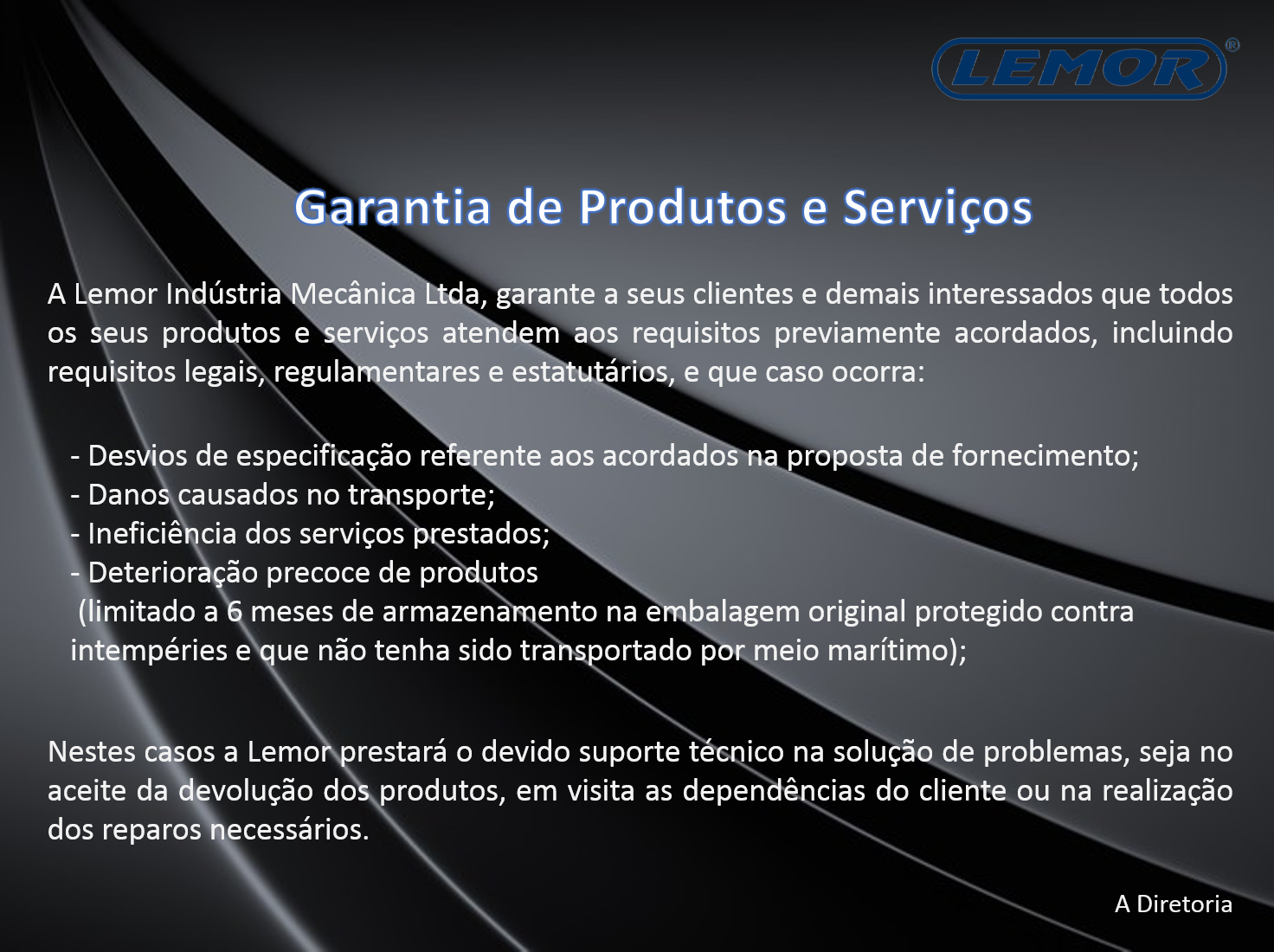 A política de qualidade da Lemor é ser reconhecida no mercado como fornecedor de componentes e equipamentos para diversos segmentos, atendendo a demanda de seus clientes e a busca de novos segmentos de mercado no Brasil e no Exterior.